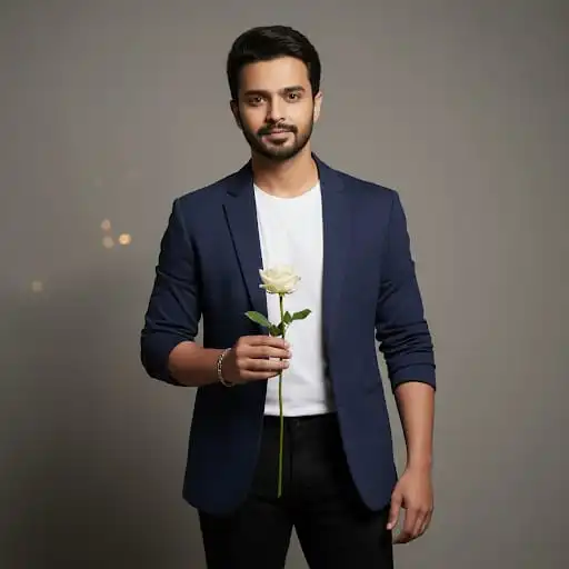 A handsome young man with neatly styled dark hair and a trimmed beard is standing confidently while holding a single white rose. He is wearing a fitted navy blue blazer over a plain white t-shirt, paired with slim black trousers. A silver bracelet is visible on his right wrist. His expression is calm, with a soft smile as he looks directly at the viewer. The background is a muted grey wall with subtle light gradients, and a gentle shadow falls to his left. Small bokeh lights are faintly visible, adding a dreamy, cinematic atmosphere. Ratio: 9:16